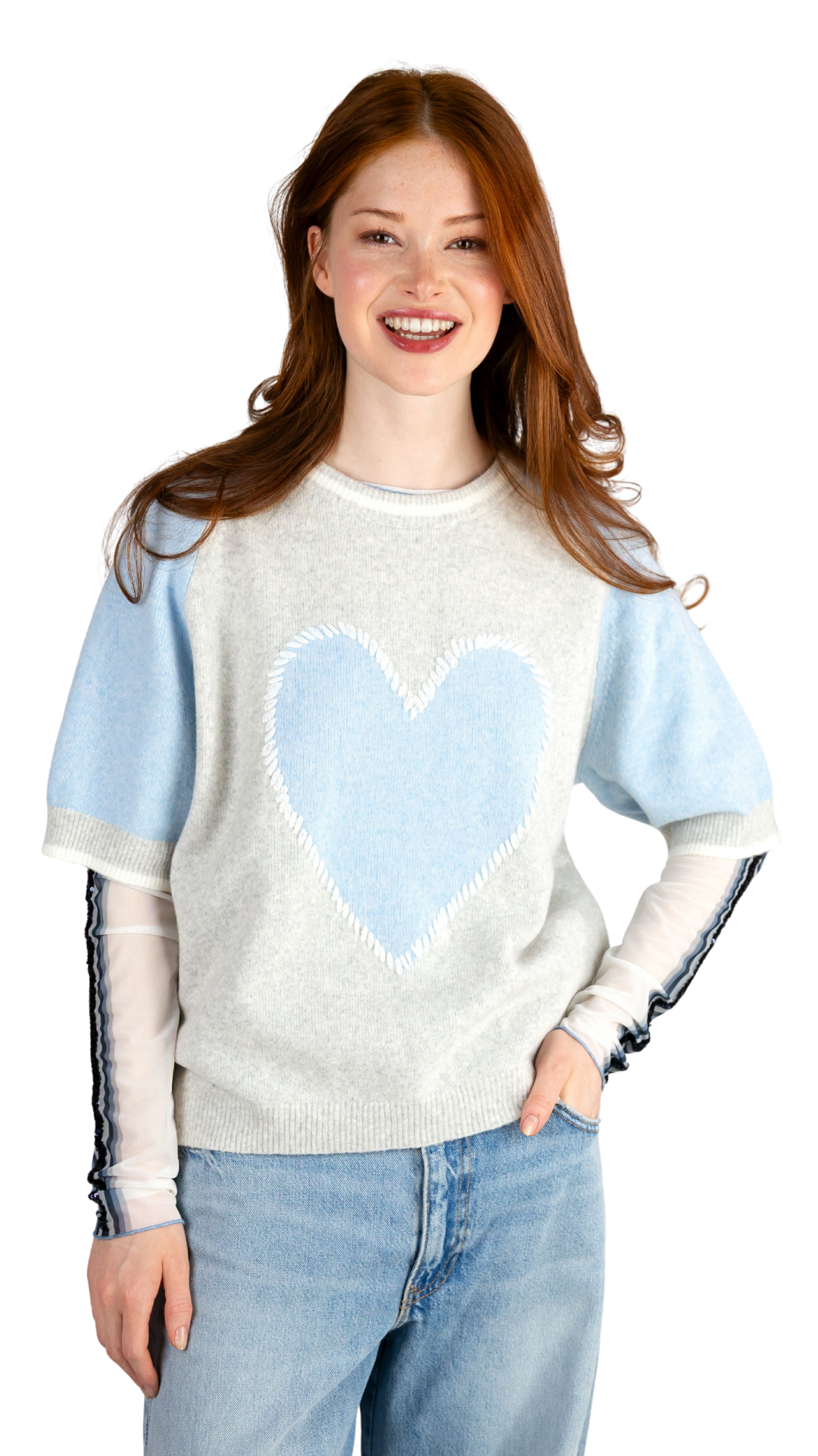 Tags: mit Pailletten-Herz, lässiger Pullover, mit Rundhalsausschnitt, mit kurzen Ärmel